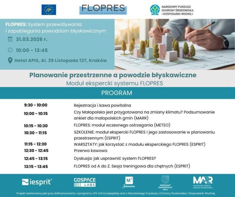 W dniu 31.03.2026 r., w hotelu APIS w Krakowie odbędzie się kolejne spotkanie związane z wdrażaniem projektu pn. Flash Flood Prediction and Prevention System – FLOPRES (Program LIFE 2022), pn. PLANOWANIE PRZESTRZENNE A POWODZIE BŁYSKAWICZNE. MODUŁ EKSPERCKI SYSTEMU FLOPRES.